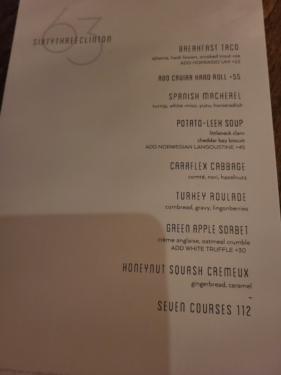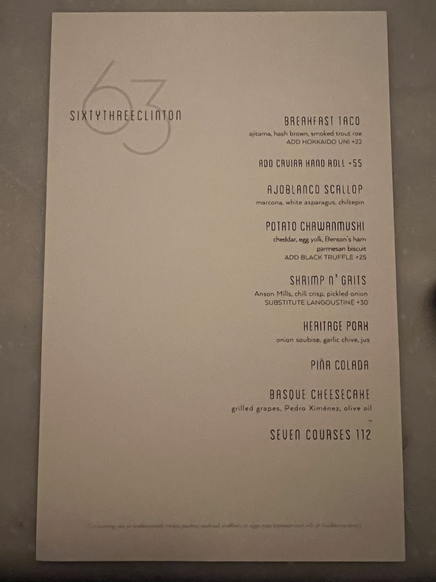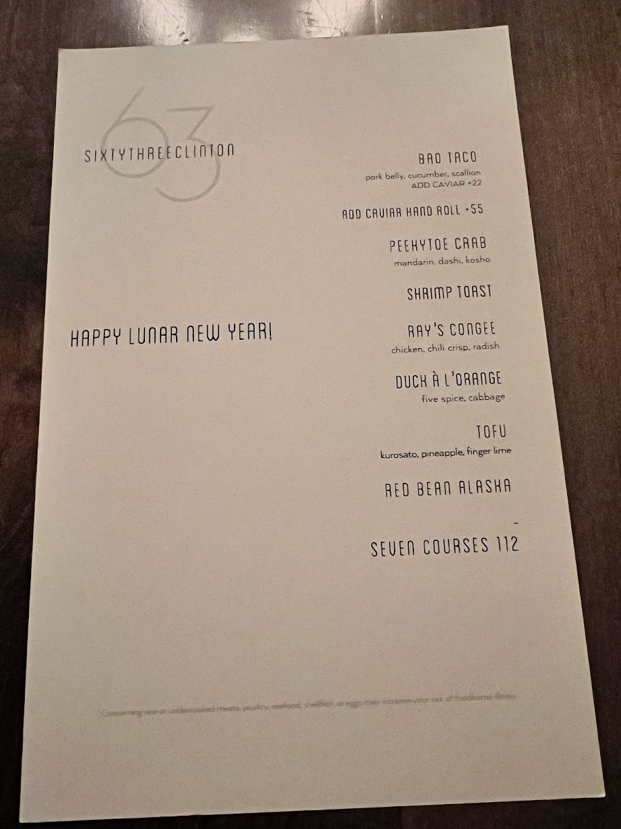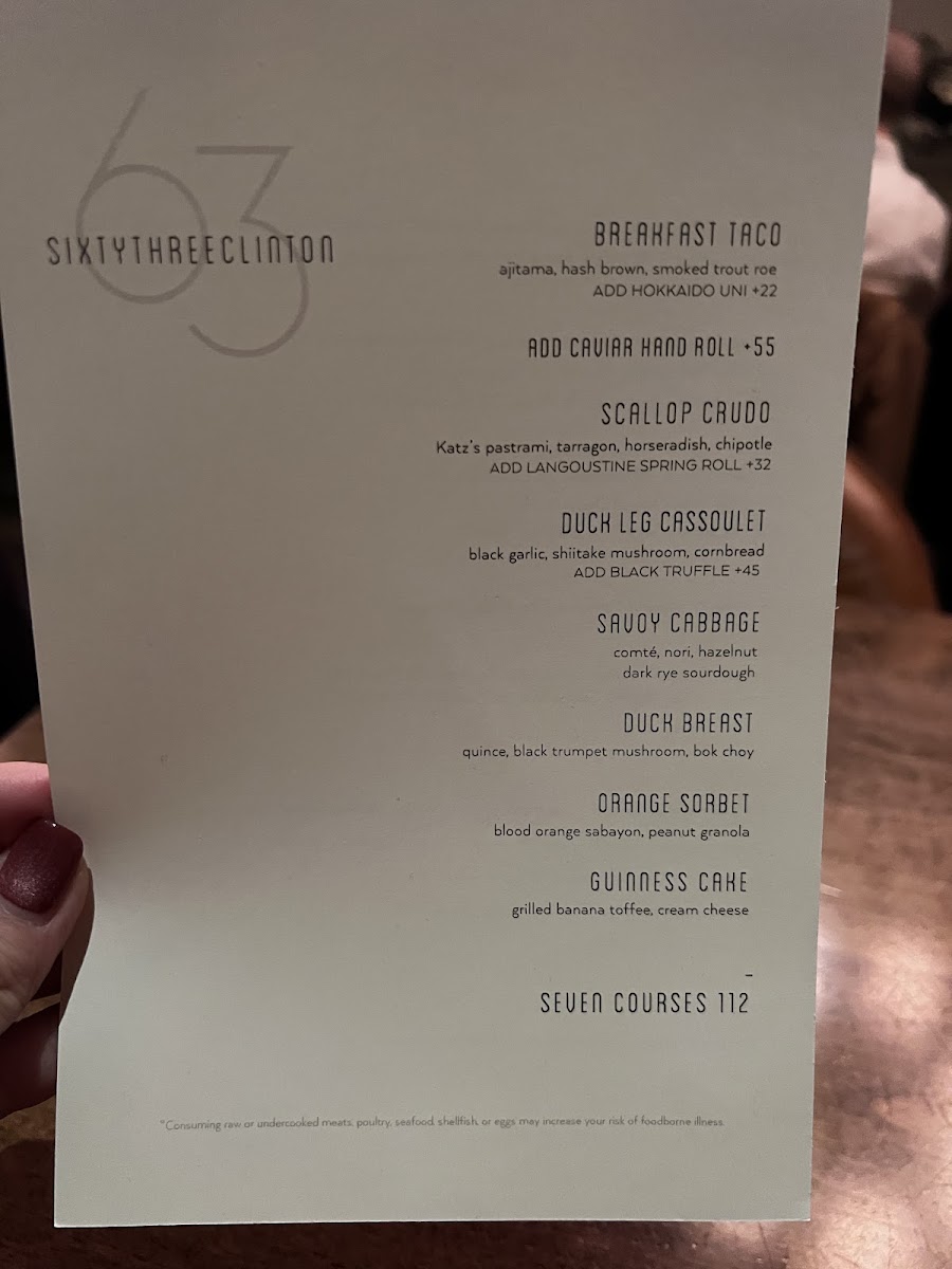 Welcome to Sixty Three Clinton, a culinary gem nestled in New York City's vibrant Lower East Side at 63 Clinton St. This restaurant promises an unforgettable dining experience where innovative cuisine meets exceptional service. The menu is a delightful journey through bold flavors, showcasing standout dishes like the tantalizing Uni Tacos and the highly praised Caviar Hand Roll. Reviewers rave about the Seafood Pasta and the comforting Cheese Soufflé, all crafted with meticulous attention to detail.